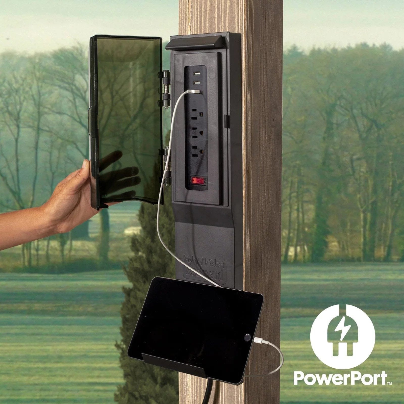 - POWERED UP: Exclusive removable PowerPort™ features 3 electrical outlets and 3 USB ports that is transferable to any post on the structure. PowerPort™ can be used for charging devices, lights and more. PowerPort™ requires a power source to be functional (not included)