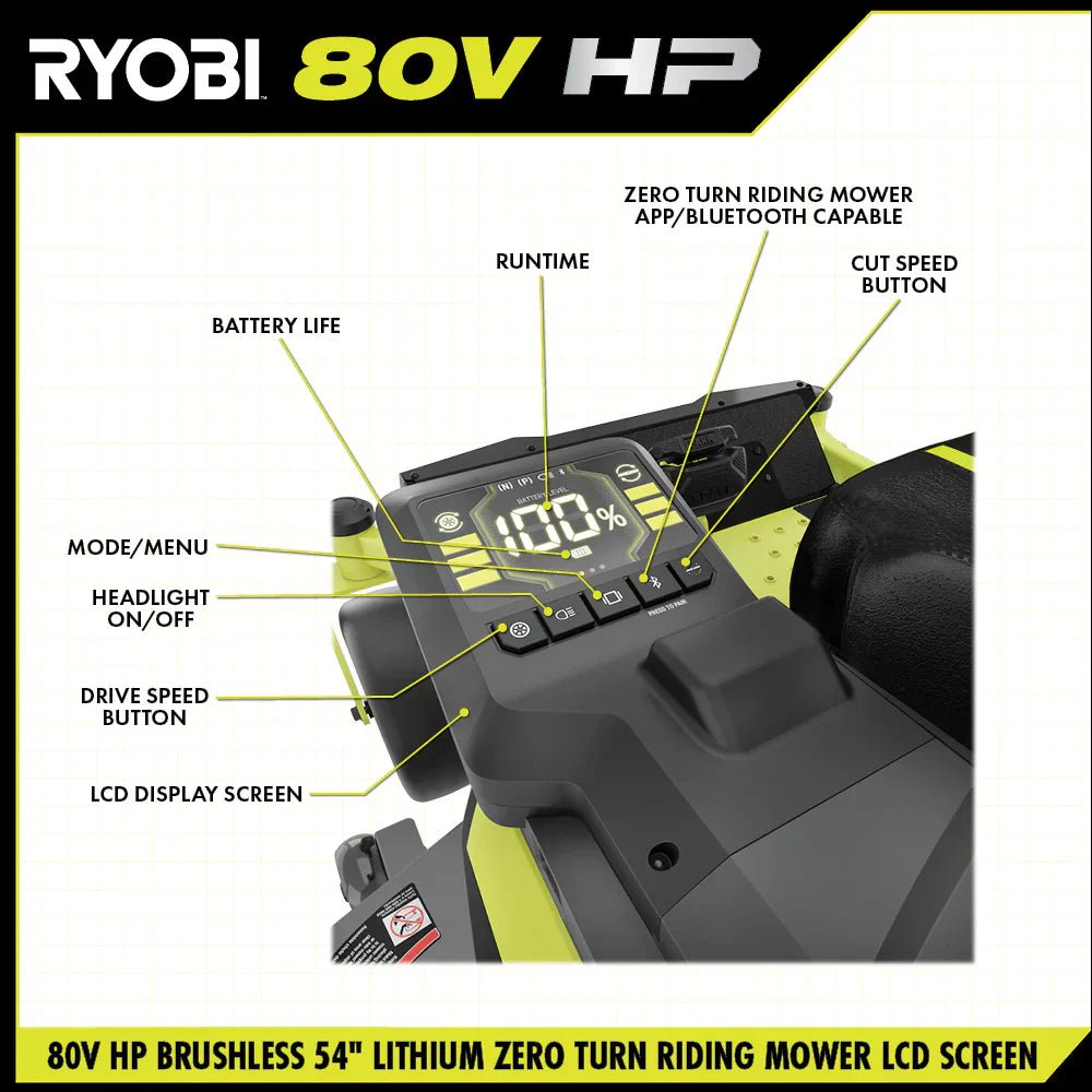 Introducing RYOBI’s first lithium-ion battery powered zero turn riding mower, the RYOBI 80V HP 54″ Lithium Electric ZTR*. HP Technology and 80V batteries combine to deliver the power equivalent of a 42 horsepower gas engine*, while eliminating the hassle and maintenance of a gas mower. This rider cuts up to 4 acres per charge with the help of 5 brushless motors, (3) 80V 10Ah batteries, and (4) 40V 12Ah batteries, with a Hyper Charger that fully recharges in 5 hours so you’re ready for your next job. The revolutionary iDrive system uses an intuitive one-handed joystick steering to maneuver around objects more easily than a traditional ZTR. The innovative LCD screen displays runtime, battery life, and cut/drive speed while in use, while the Riding Mower app allows you to monitor charge time and battery life remotely. This riding mower features the CROSS CUT multi blade system, providing superior cutting & mulching performance, while the 12-point height adjustment allows you to select the perfect cutting height between 1.5″ and 4.5″. The rubber side discharge chute makes it easy to maneuver around landscaping so users are not restricted by where they can cut. Designed with comfort and convenience in mind, this mower features premium seat suspension, 2 USB ports to charge phones, a storage compartment, and LED headlights. Mobile Service available in select regions. If your riding mower requires attention, a certified RYOBI support technician can diagnose & service right from your home. Some services may require you to bring your mower to one of the 300+ service centers nationwide. Lawn maintenance will never be the same thanks to the RYOBI 80V HP Brushless 54″ Lithium Electric Zero Turn Riding Mower.