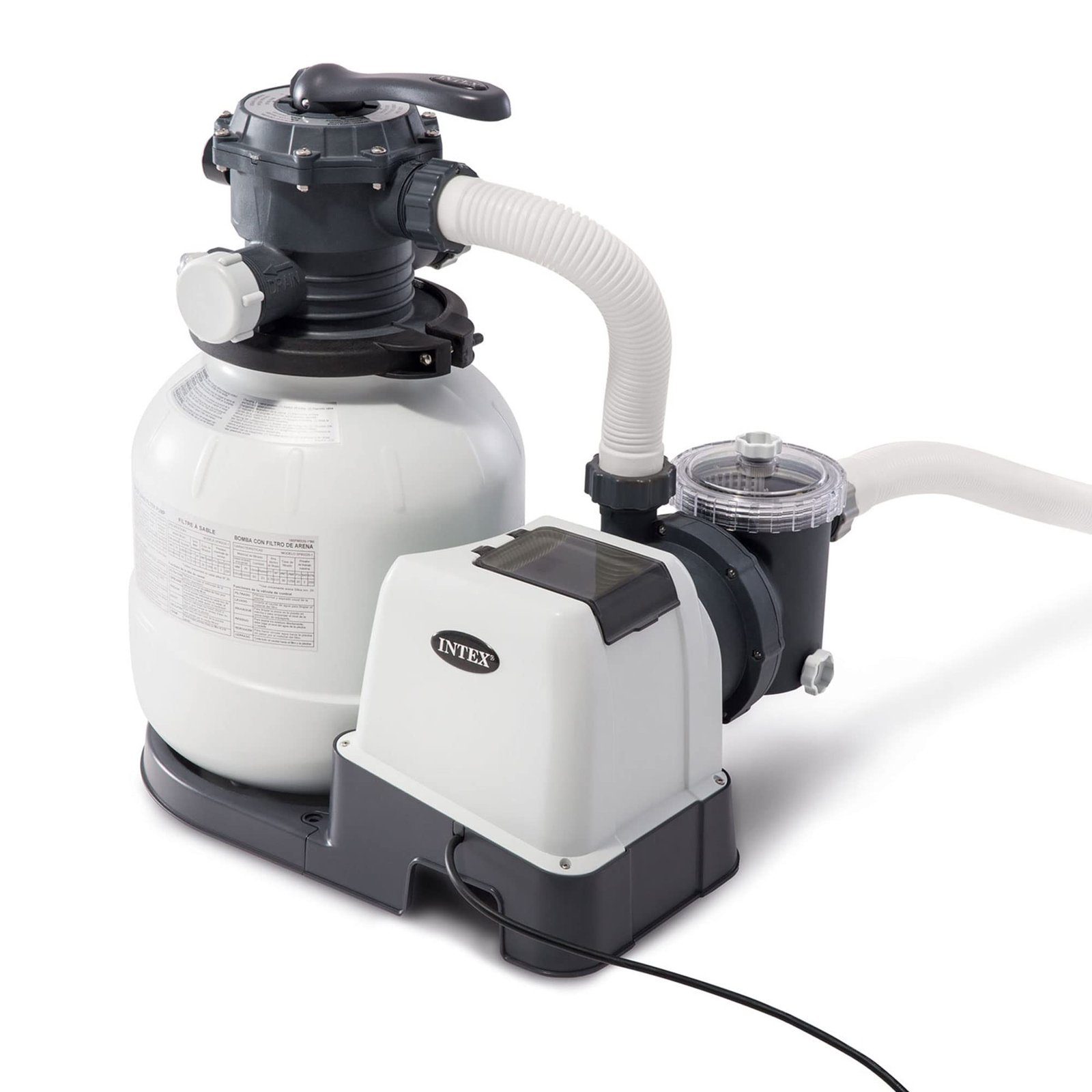 - Round 18-foot pool includes Intex model 26645EG Krystal Clear 120v sand filter pump for cleaner water, a pool ladder, a ground cloth, and a convenient pool cover