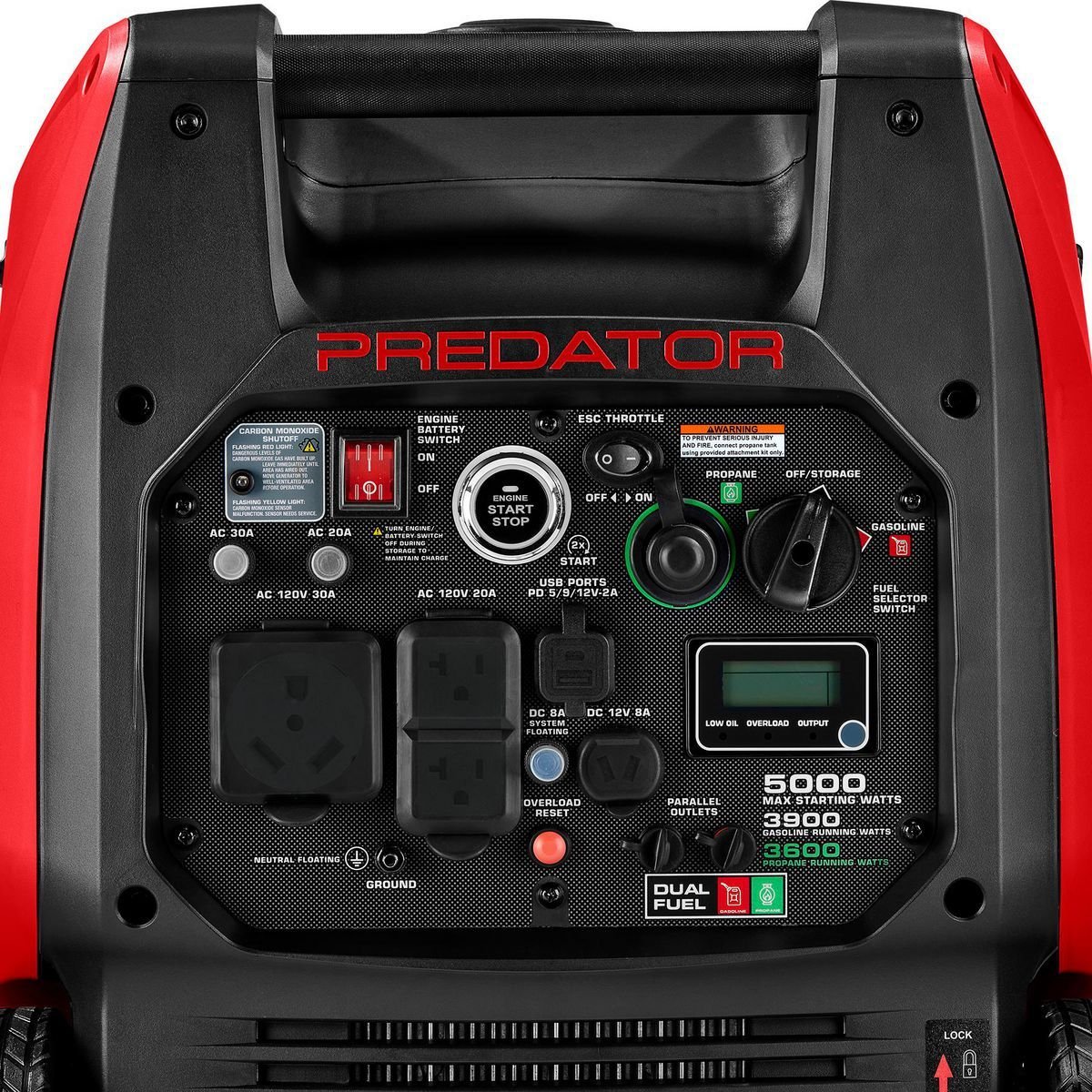 The PREDATOR® 5000 Max. Starting Watt Dual-Fuel SUPER QUIET™ Inverter Generator with CO SECURE® has dual-fuel capability to run on gasoline or propane. Powered by a reliable PREDATOR® 224cc gas engine, this generator has a TT-30 RV outlet and an extra-large fuel tank that delivers over 18 hours* of runtime, making it an unbeatable value. The push-button electric start powers the generator on and off with the press of a button, no manual choke required. A remote starting option lets you start up and shut down the generator from up to 100 ft. away. The 5000 starting watts and 3900 running watts make this an ideal RV generator with enough power to run most air conditioning units.